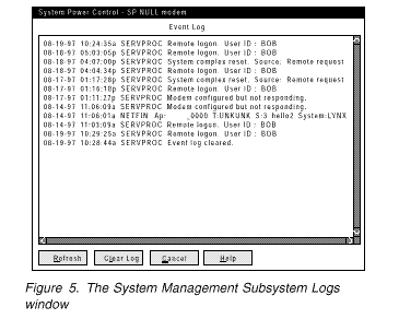 Event Log: Use Event Log to open the System Management Subsystem Logs window (shown in Figure 5). This window contains all entries that are currently stored in the system management subsystem event log. Information about all remote access attempts and dialout events that have occurred is recorded in the system management subsystem event log.
