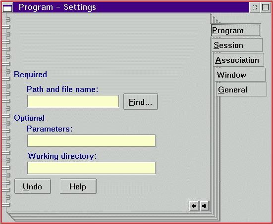 The Settings notebook for the new program icon will be displayed as above. Fill in the path to the program (or click the Find button to have OS/2 find programs for you); click the General tab and fill in the program name in the Title section.