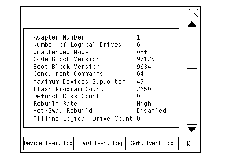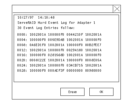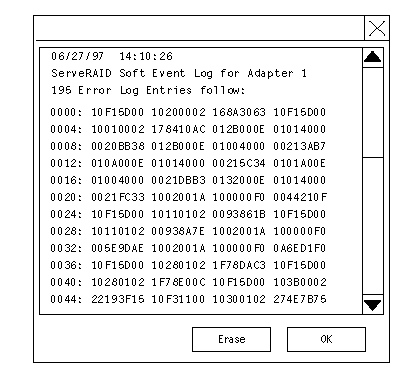 Monitoring Event Logs: The ServeRAID controller stores, in the event logs, information concerning various unexpected events. There are three types of event logs: a device event log, a hard event log, and a soft event log.