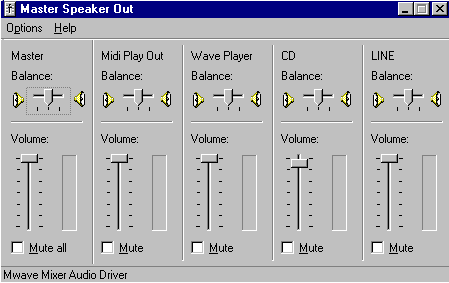 2. Click on "Options". A drop down menu appears. If there is no check before "Advanced", click on it to place a check there and close the drop-down menu.* This causes three buttons labled "Advanced" to appear on the program under the "Master", "CD" and "Line" headings.