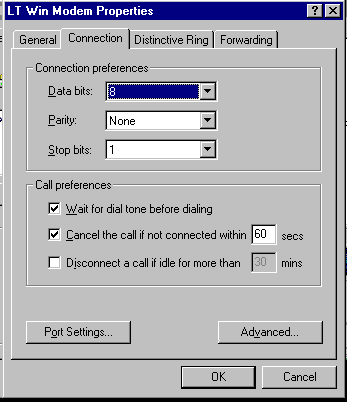7) Click 'OK' twice to get back to the 'Modem' screen, then click on the 'Dialing Options' button and verify that it is setup as shown in Figure #6. Insert your correct area code in the 'Area code' box and '1' in the 'For long distance' box. There also is an option to disable call-waiting. This restricts an incoming call from disrupting a FAX or a file download. The code for this is available from your local telephone company. It is usually something like '*70'.