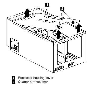 2. Turn the two quarter-turn fasteners 2 on the processor housing cover 1 one quarter turn and remove the cover from the processor housing.