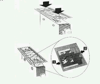 3. Place a pair of installation clips at each end of the row of vents. One clip attaches to the last vent; the other clip attaches to the third vent from the end as shown in the illustration. Rotate each set of clips into the vertical position.