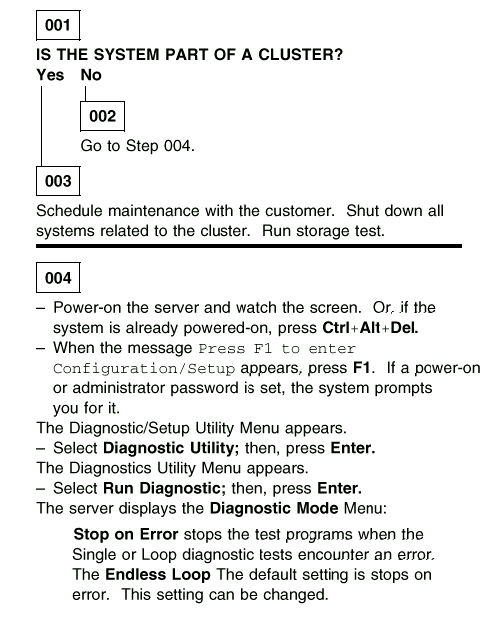If the failing system is suspect to be part of a shared DASD cluster, all diagnostic tests can be run except diagnostic tests which tests the storage unit (DASD residing in the storage unit) or the storage adapter attached to the storage unit.