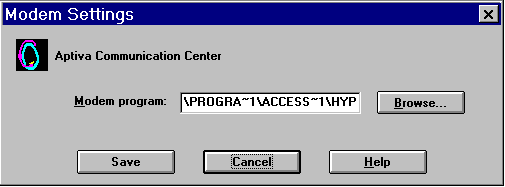 5. The next button is "Modem". This setting determines the path for the default communications program to be used by the modem. The default program in Windows 95 is HyperTerminal. The default path is: