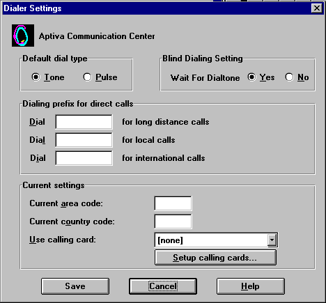 6. Next, click on the "Dialer" button. Under "Default Dial Type" the "Tone" radio button should be filled and under "Blind dialing Section" the "Wait for dialtone" radio button should be filled. Next to "Use Calling Card" it should say "None". Click "Cancel" to exit or 'Save' if you wish to save changes. Refer to Figure #5 for the default settings. In most cases, a user would insert "1" in the