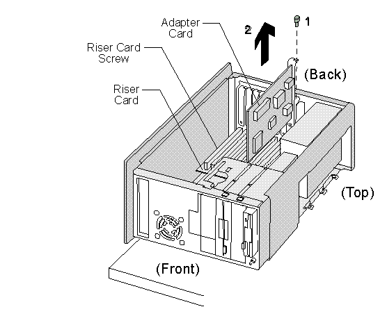 11. Reseat the riser card as follows: (The riser cards plugs into the mother board of the system and has the sockets for all the adapters.) Remove all other cards as above. Remove the screw at the bottom of the riser card. Remove and reinsert or reseat riser card, making sure that it is pressed firmly into slot. Inspect connections for damage.