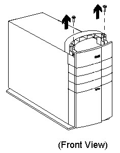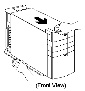 7. The entire cover will slide on two tracks on bottom of tower. If the cover sticks in the tracks, it can often be freed by a sharp jerk forward on handle to remove it. An alternative method may be used: Place the thumb of your left hand on the CD-ROM below the drawer. Place the fingers on your left hand on the floppy drive. Hold the handle with your right hand. Now, pull with your right and push with your left. Everything will slide forward except the floppy, CD-ROM and bay covers.