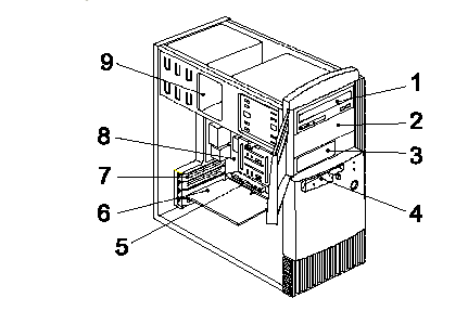 This computer system has four bays that can hold 5.25-inch and 3.5-inch drives. Additional devices can be installed in the empty bays. Diskette drives in this unit use the standard diskette advanced technology (AT) interface. Hard disk drives in this unit use an integrated drive electronics (IDE) AT interface. This computer supports the American National Standards Institute (ANSI) standard for AT attachment disk drives. It also has interface slots for installation of additional cards devices. Industry