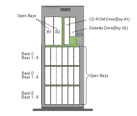 Internal drives are installed in bays. A diskette drive and a CD-ROM drive are preinstalled in bay A in all models. A removable CD storage compartment is shipped in bay B1. You can install two drives in bay B. You can install hot-swappable hard disk drives in banks C, D, and E only. Banks C, D, and E each contain six bays. Bank C supports up to six drives. However, the total number of SCSI drives that you can install in bay B and bank C is six. The number of preinstalled hard disk drives in bank C varies according to the model you purchased. You can install up to six drives in bank D and up to six drives in bank E.