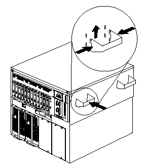 b. Move the handle up in the slots so that the hooked part of each tab is inside the server. Release the pressure on the sides of the handle.