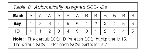 Each of the two SCSI backplanes in the server supports one bank (six) of hot-swap bays. Table 8 shows the default SCSI IDs that the backplanes assign for hot-swap hard disk drives.