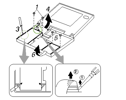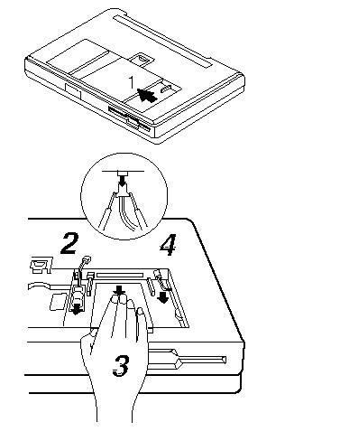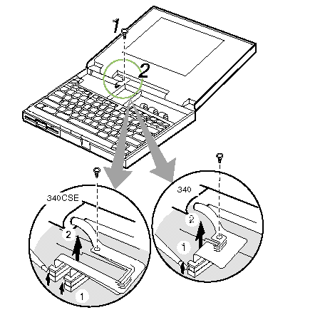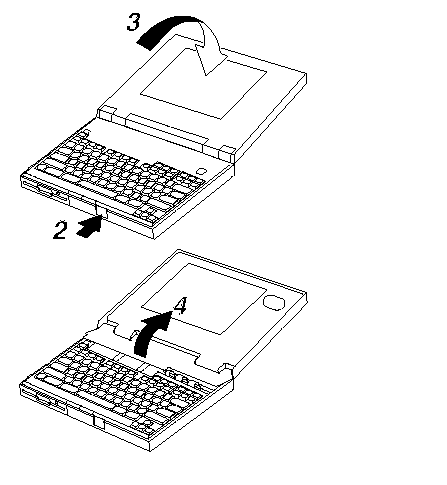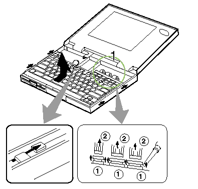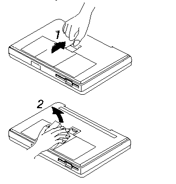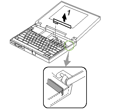 1. There are two keyboard latches on each side of the computer frame. Slide the keyboard as shown in step 2 to release the keyboard from those latches; them remove the keyboard. (Small arrows on the both sides of the keyboard show the locations of the latches.)