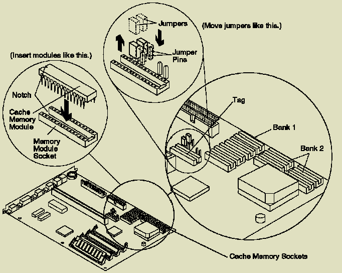 To upgrade from 0KB cache to 128KB or 256KB, you need to add either 4 (for 128KB) or 8 (for 256KB) 28-pin modules (32K x 8, 25ns). You also need to add a TAG module (32K x 8, 20 ns SRAM for 256KB or 8K x 8, 20 ns SRAM for 128KB)