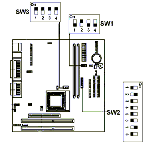 6. The "floor" of the computer, a green surface onto which all components are attached, is called the motherboard (sometimes also called the "planar" or "mainboard"). On the motherboard there are three sets of switches labeled "SW1", "SW2" and "SW3"” "SW1" is located near the top of the motherboard, "SW2" is located vertically to the right of the DIMM sockets, and "SW3" is located above the CPU. We recommend you cut the white plastic tie wrap that is around the 3 grey ribbon cables with a pair of household scissors. This will allow easier access to the switches below. Be very careful not to cut the grey ribbon cables or any surrounding wires.