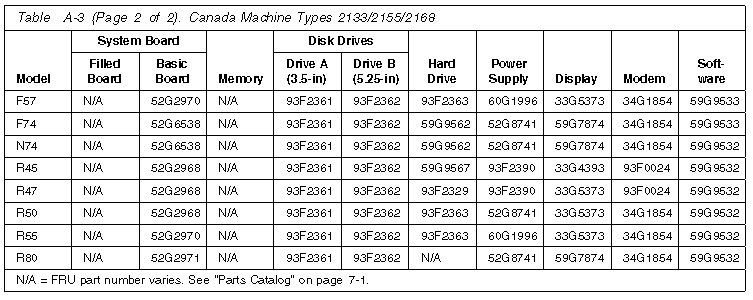 PS/1 - FRU Part Numbers for Canada M/T 2133/2155/2168