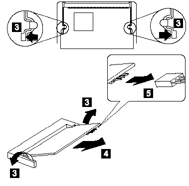 Press the release latches on both sides of the modem board (3), then pull out the modem board (4). Then disconnect the modem cable (5).