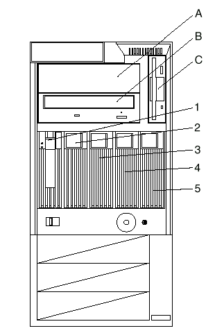 Your server comes with a CD-ROM drive installed in bay B and a diskette drive installed in bay C.