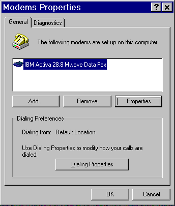 5. Depending on the modem, the Modem Properties window could have multiple tabs to click on. The Mwave Data Fax modem is shown below.