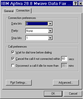 6. The Mwave Modem Properties window above is showing on the Connections tab. This Mwave Modem Properties window will open on the General tab. Click on the Connection tab to bring that page forward so that it looks like the figure above. If another modem is installed, a click on the Connection tab will bring up the Connection's Page as well.