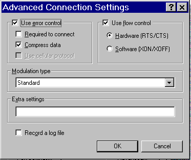 8. Click on the box next to the line "Use error control" to remove the check out of the box. If the check is in the box, error checking is enabled. Removing the check, turns off error correcting. The three boxes below and the items, Required to connect, Compress Data, and Use cellular protocol will now be grayed out since the error control is turned off.