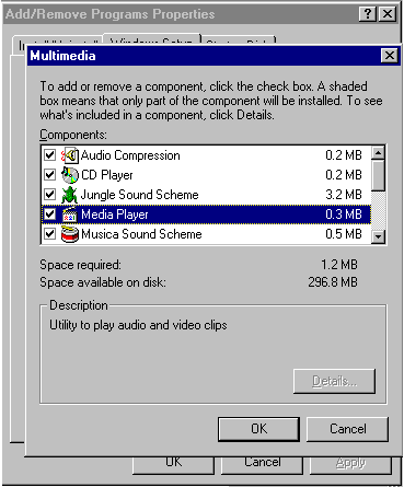 1. Go to the "Windows Setup" screen mentioned above. Scroll down to "Multimedia", then find "Media Player", and click on the box to put a check in it. Click "OK" and on the next window click "Apply".