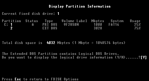 Enter choice "4" and press "Enter" key. This will bring you to the "Display Partition Information" screen similar to the one shown below. Earlier models usually only have one partition and will have no option for EXT DOS information.