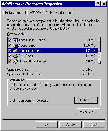 2. Click the "Windows Setup" tab, this will display a list of the installed Windows 95 components. Locate the Communications list entry, and double-click the phone icon (or click on the "Details" button) to display a list of the Communications related components.
