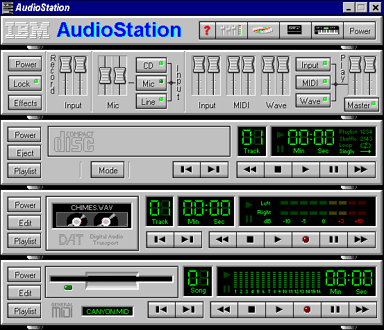 2. Figure 1 shows the Audiostation starting from the top to the bottom with the PowerBar, the Audio Mixer, the CD Player, the Wave Player, and the MIDI Player or modules. The PowerBar will always be at the top, but the other modules may be in different orders or not present.