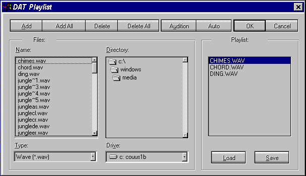 3. Click on the Add button at the top of DAT Playlist Window. This places the file in the Playlist column.