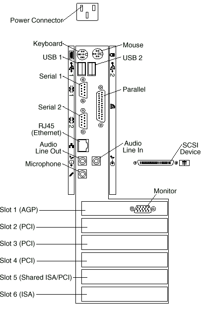 SCSI Connector: SCSI devices attach here. For more information, see "Adding External SCSI Devices", "Attaching External Options", and "SCSI Connectors". |