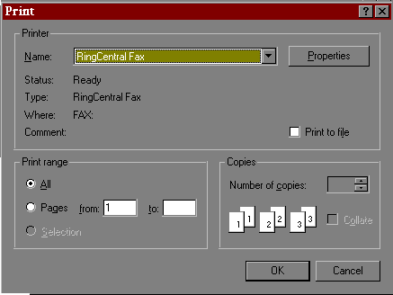In the box to the right of "name" make sure that "Ring Central Fax" is present. If it is not, then click on the down arrow on the right side of the box and in the menu that pops down, click on "Ring Central Fax". This will redirect the document to the fax modem instead of the printer. Click "OK", and the information window will come up similar to Figure #5.