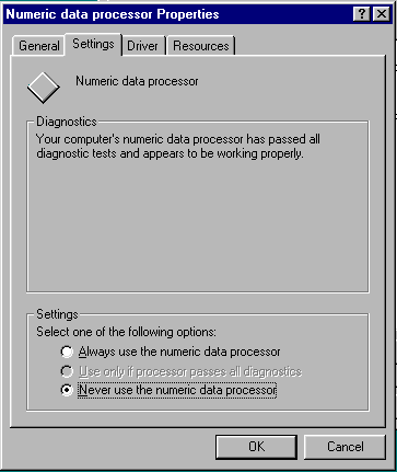 To disable the numeric data processor in Windows 95, go to the device manager and perform the following steps: