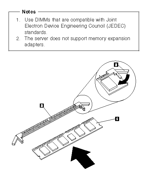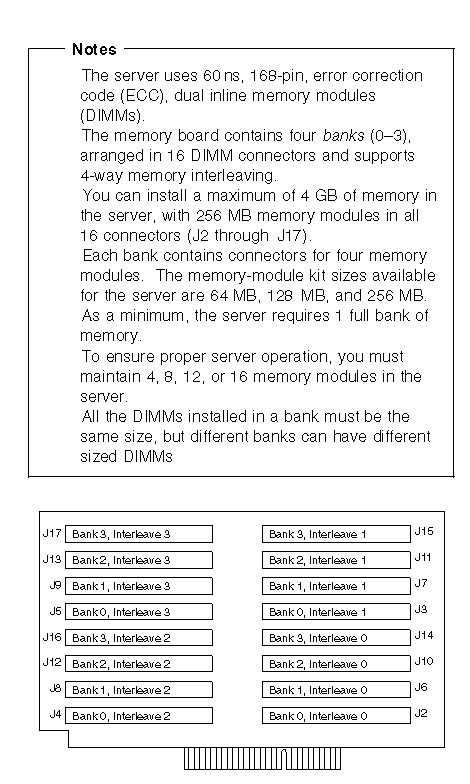 The base memory is four 64 MB DIMMs. The DIMMs are installed in bank 0, connectors J2-J5. You want four 64 MB DIMMS, eight 128 MB DIMMs, and four 256 MB DIMMs in the server. Leave the 64 MB DIMMS in bank 0, connectors J2-J5 and install the 128 MB DIMMS in bank 1, connectors J6-J9 and bank 2 connectors J10-J13 and the 256 MB DIMMs in bank 3, connectors J14-J17.