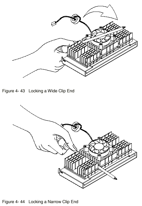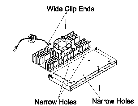 The Pentium II processor module comes with holes on one side to hold the clips of the heat sink and fan. The upper set of holes (near the latches) on the processor are wider and should match the wider ends of the clips on the heat sink. The lower set of holes are smaller and should match the narrow ends of the heat sink clips.