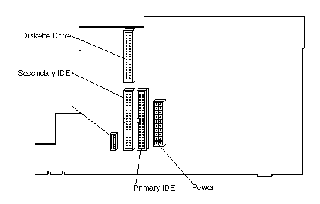 - The diskette drive, hard disk drive (if applicable), and CD-ROM drive that are preinstalled in the server come with power and signal cables attached. The CD-ROM drive is attached to the primary IDE connector on the back of the riser card. If you replace any drives, it is important to remember which cable is attached to which drive.
