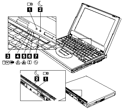 The system status LED indicators show the current computer status. The following shows the location of each indicator symbol and the meaning of each indicator.