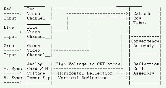 The symptom is a horizontal white scan line across the center of the monitor. It is usually caused by a component failing in the vertical oscillator or deflection circuits of the monitor. Using the block diagram above, we can often determine the missing functions and the most likely failing unit.
