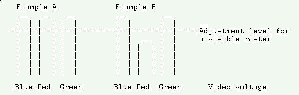 In example A, a white self test raster is visible because RED, BLUE and GREEN video gains are in close balance, therefore the human eye actually perceives "White". Without this balance, a color other than white will be seen. In example B, a non-white raster is visible because the Red video gain is too low for proper "white balance." In extreme cases of mal-adjustment, the Self-Test raster may not be visible. Adjusting one of the video gains "up" may provide a visible raster, which by following the adjustment procedure on page 8-20, can be adjusted to meet all functional criteria without FRU parts replacement.