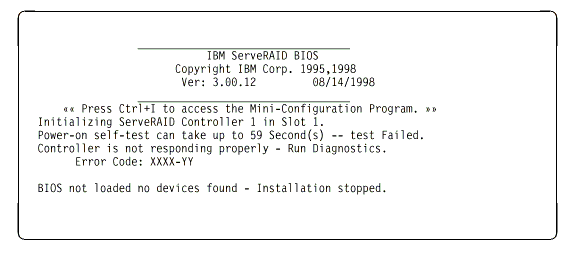 If there is a POST Error message, the BIOS screen resembles the sample shown below. Refer to "ServeRAID POST error codes" and correct the problem.