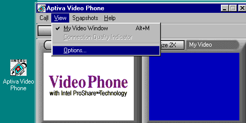 6. Click on the "Aptiva Video Phone" menu View Item and a drop down menu should appear. Select the Options Menu selection by clicking on "Options". This should look like Figure 2 below.