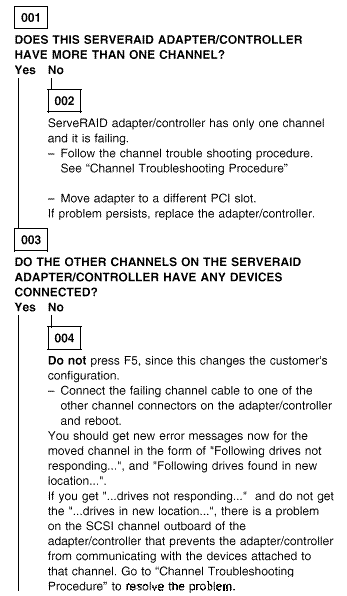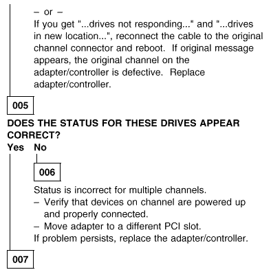 If you get the "...drives not responding" message, and do not get the "Following drives found in new location...", there is a problem on the SCSI channel outboard of the adapter/controller that prevents the adapter/controller from communicating with the devices attached to that channel.