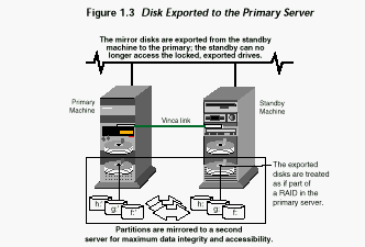 StandbyServer lets you choose which disks are exported from the standby machine. The exported disks are locked from the standby machine, and are treated by the primary server as though they were local to that server. Exported disks cannot be accessed by the standby machine until the primary server fails and the standby fails over.
