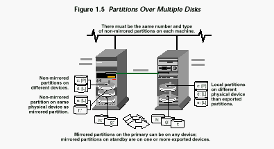For example, the partitions shown in Figure 1.4 could be arranged as shown in the following example (Figure 1.5). What is important is that the operating system be able to assign the original partition and the mirrored partition the same drive letter, not that there be a similar number of disk devices or that each machine have similar partitions on corresponding disk devices.