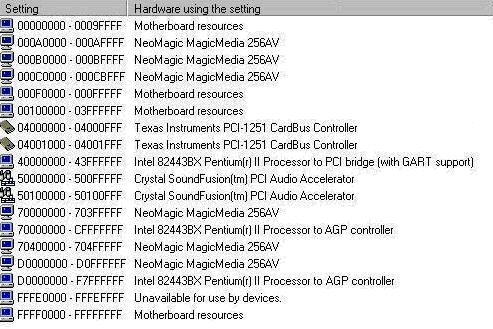 These are the default System Resources allocated by Windows 98 on ThinkPad 600E.