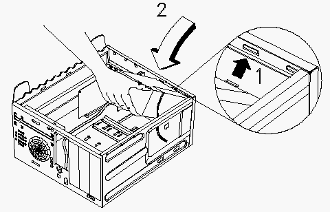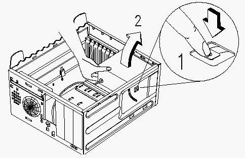 3. Press the tab (1) located on top of the housing frame just above the power supply.