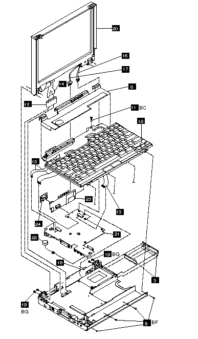1. Replace the screw (BC) in step (11) shown in the figure. Do not tighten the screw until the front keyboard screws are in place.