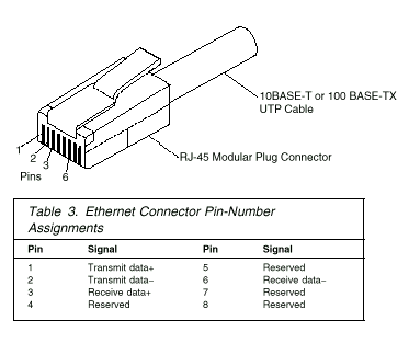 Table 3 shows the pin-number assignments for the RJ-45 connector. These assignments apply to both 10BASE-T and 100-BASETX devices.