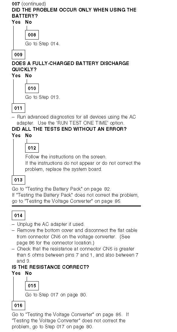 If the voltage is not greater than that measured in Step 5, replace the AC adapter, then go to the next step. If the voltage is greater than that measured in Step 5, the battery pack is good. Repeat Steps 6 and 7 using a new AC adapter. If the voltage is still not greater than that measured in Step 5, replace the voltage converter.