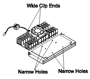The Pentium II processor module comes with holes on one side to hold the clips of the heat sink and fan. The upper set of holes (near the latches) on the processor are wider and should match the wider ends of the clips on the heat sink. The lower set of holes are smaller and should match the narrow ends of the heat sink clips.